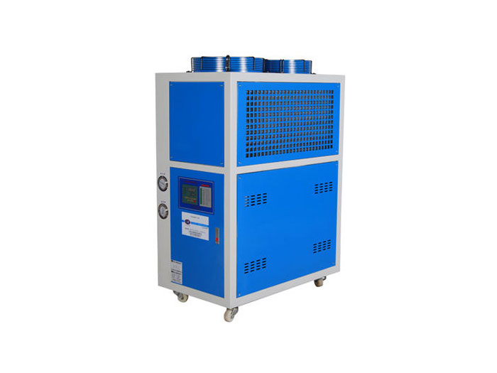 The air cooling box type cold water machine is mainly composed of a scroll compressor, an efficient V type fin condenser, a filter, a liquid path control valve, a thermal expansion valve, an inner thread copper tube evaporator and an electric control system.